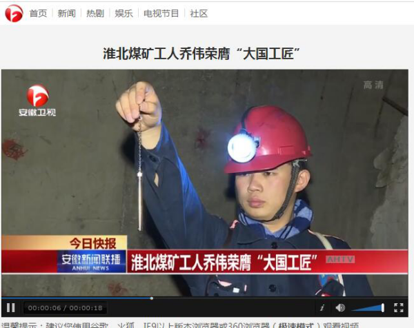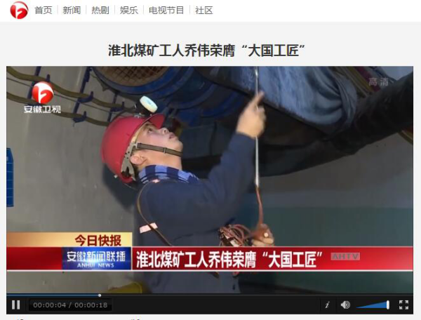 7月10日,安徽電視臺《安徽新聞聯(lián)播》節(jié)目播出淮北礦業(yè)袁店一礦瓦檢工喬偉榮膺“大國工匠”消息。