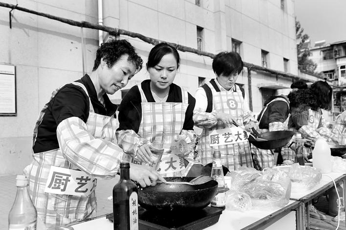 10月16日,淮北礦業(yè)集團(tuán)桃園煤礦工會舉辦的“綠色廚藝 安全我家”比賽現(xiàn)場上,參賽的婆媳攜手精心制作精美菜肴,展示嫻熟廚藝。陳敏奎 攝