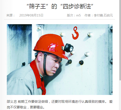 邵義忠2005年大專畢業(yè)來到安徽淮北礦業(yè)集團臨渙選煤廠工作后,一直從事旋流器、直線振動篩的維護、維修工作,對直線振動篩、弧形篩等篩子的“脾性”了如指掌。他經(jīng)過十幾年的工作積累,總結(jié)出了一套“聽(聽篩子有無異常聲音)、摸(摸激振器與過橋軸承組件溫度)、踩(踩篩板與軌座是否松動、刷爛)、測(測激振器油位)”“四步篩子診斷法”,有效提高了篩子故障發(fā)現(xiàn)率,杜絕突發(fā)事故的發(fā)生,大大縮短了事故臺時。這個方法在同行中得到廣泛推廣和應(yīng)用。為此,大家給他起了個“篩子王”的綽號。