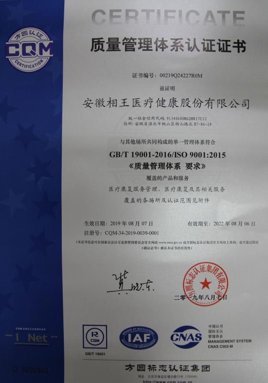 日前,相王健康獲得由CQM頒發(fā)的ISO 9001:2015質(zhì)量管理體系認(rèn)證證書,標(biāo)志著公司在醫(yī)院管理和醫(yī)療服務(wù)品質(zhì)邁上了一個(gè)新的臺階。