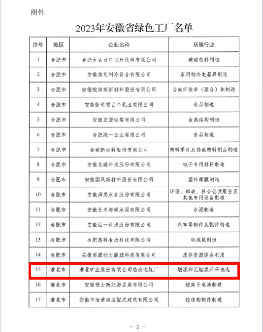 日前,安徽省經(jīng)濟和信息化廳公布2023年安徽省綠色工廠名單,淮北礦業(yè)臨渙選煤廠榜上有名,這是該廠繼去年獲評淮北市綠色工廠后的又一殊榮。