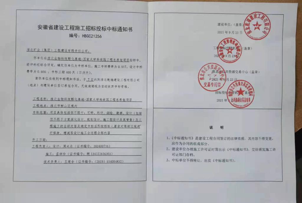 近日,工程建設(shè)公司憑借雄厚的綜合實(shí)力、優(yōu)質(zhì)的服務(wù)和良好的口碑,繼8月底以3.5億元成功中標(biāo)春曉花園二期項(xiàng)目工程后,在不到一個月的時間里,再度中標(biāo)淮北生物科技孵化基地-國家大學(xué)科技園項(xiàng)目工程,中標(biāo)金額約4.15億元。