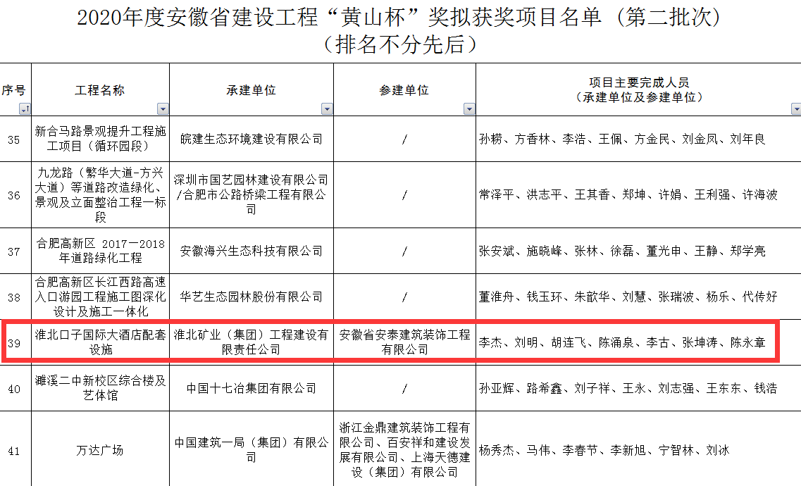 近日,省住房城鄉(xiāng)建設(shè)廳公布了2020年度安徽省建設(shè)工程“黃山杯”獲獎項目名單(第二批次),由工程建設(shè)公司承建的淮北口子國際大酒店配套設(shè)施工程以淮北市申報工程中位列第一的名次榮獲該獎項。