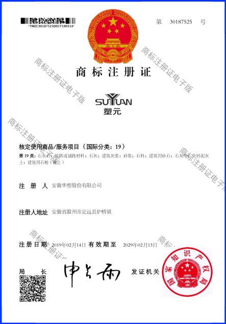 2019年一季度末,華塑股份繼主營業(yè)務PVC(聚氯乙烯)產(chǎn)品“淮滁”、“醉翁亭”商標申請注冊成功后,石灰產(chǎn)品“塑元”商標于近日收到了由國家知識產(chǎn)權局頒發(fā)的商標注冊證書,正式注冊成功。