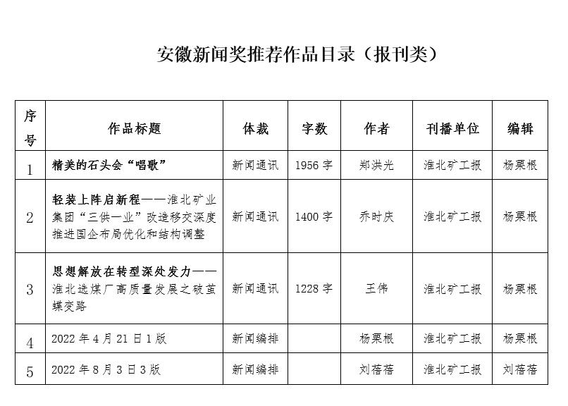 為認真做好2022年度安徽新聞獎報送評選工作,進一步提高報送評選工作的公開性、公平性和公正性,真正把好作品報上來、評出來,淮北礦工報社根據(jù)《安徽省新聞工作者協(xié)會關(guān)于開展2022年度安徽新聞獎評選工作的通知》精神和工作需要,成立評委會,并于2023年3月4日召開了評審會議,以無記名投票的方式評選出下列作品推薦參加2022年度安徽新聞獎評選。